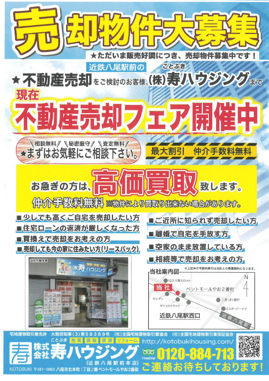 近鉄大阪線八尾駅前の株式会社寿ハウシングまで、お気軽にお電話下さい。ご連絡お待ちしております。